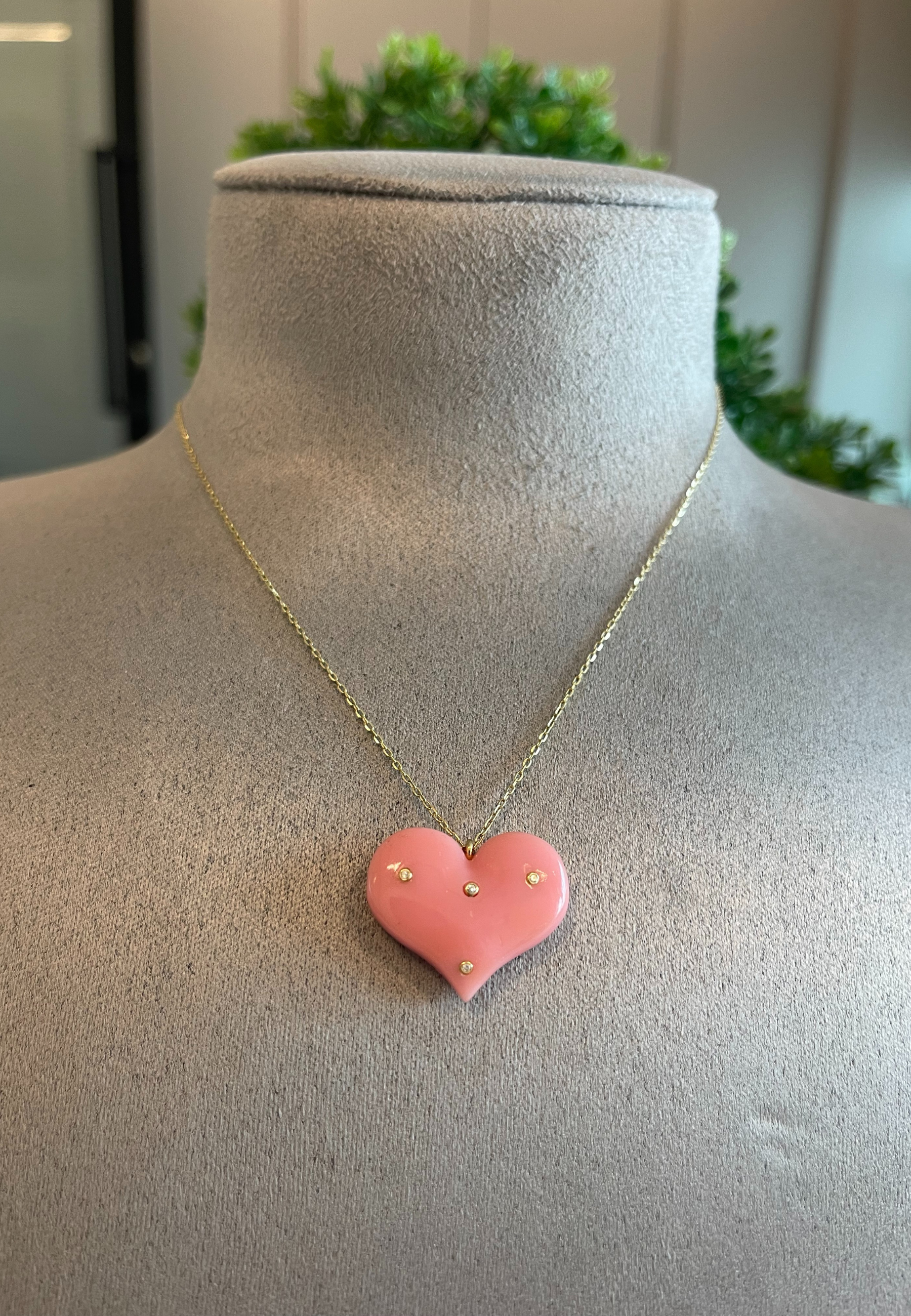 18KT Gold Pink Resin Heart Necklace with Diamonds