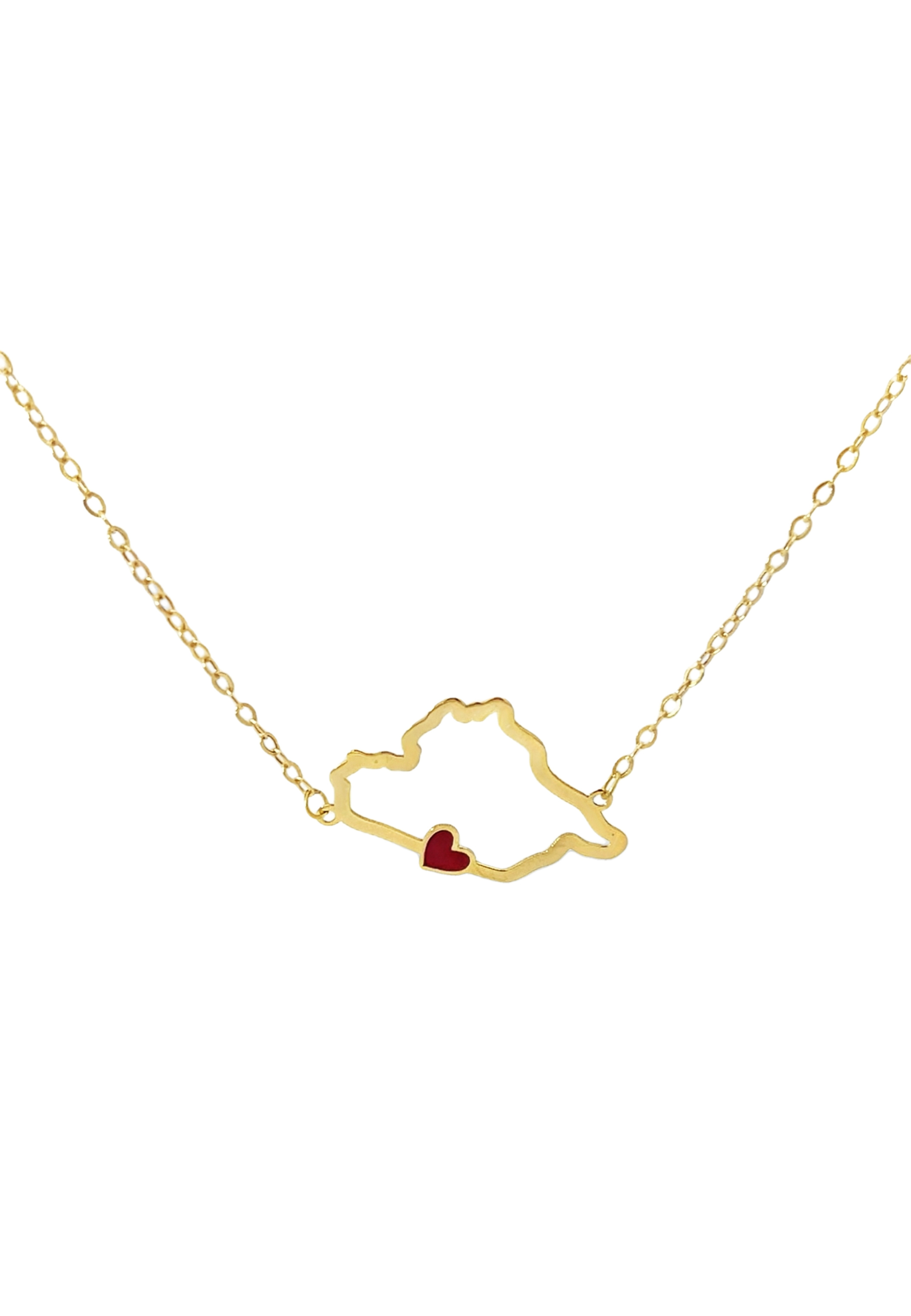 The 18KT Gold Syria Map Necklace features a finely crafted map-shaped pendant in 18 karat gold, adorned with a vibrant red enamel heart. This meaningful piece symbolizes love and connection to Syria, blending elegance with cultural significance.