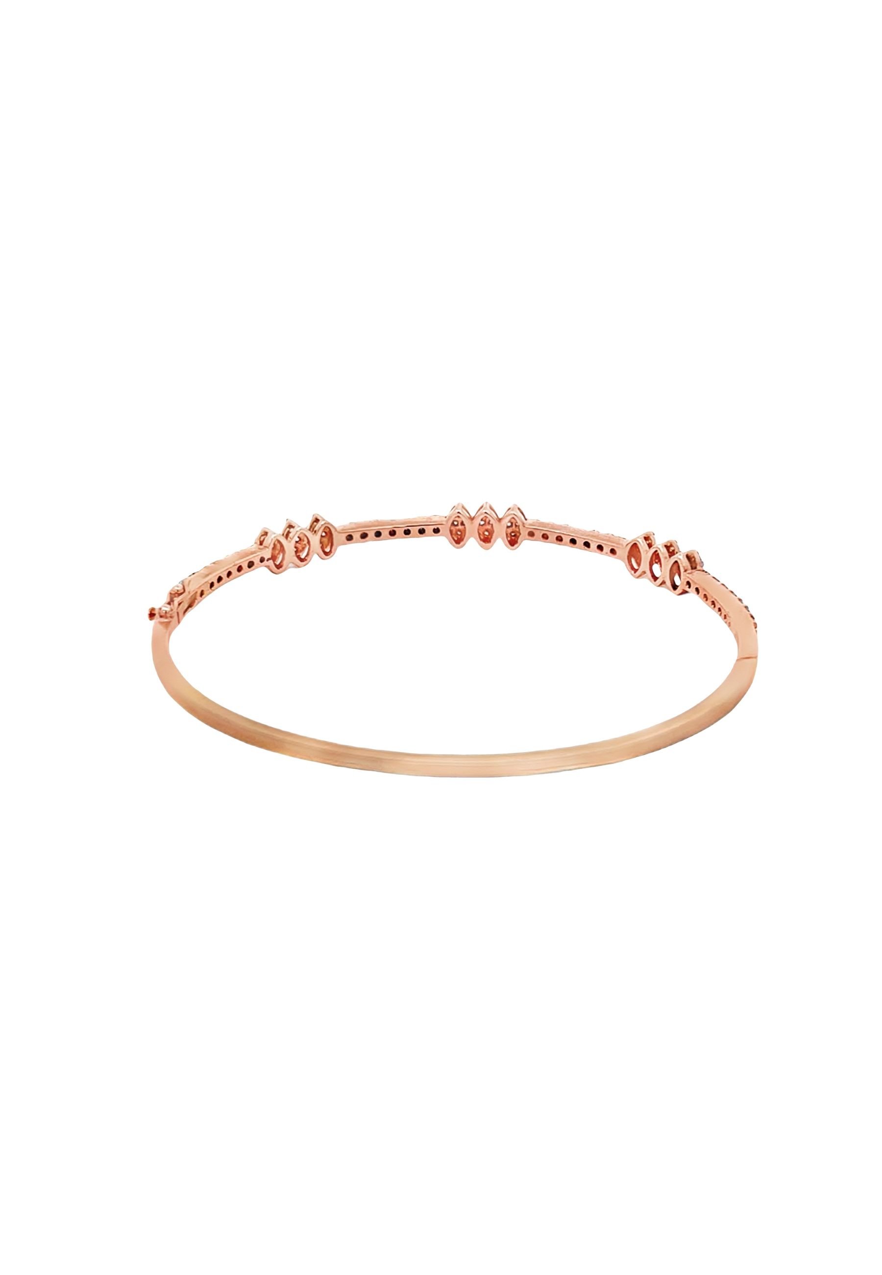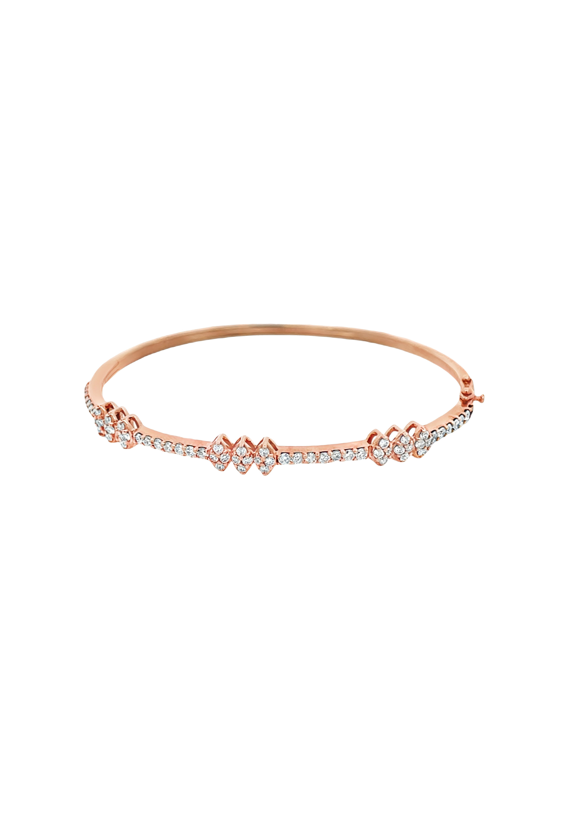 This 18KT rose gold bangle is elegantly adorned with sparkling diamonds, blending modern charm with timeless luxury. A refined piece perfect for adding brilliance to any occasion.