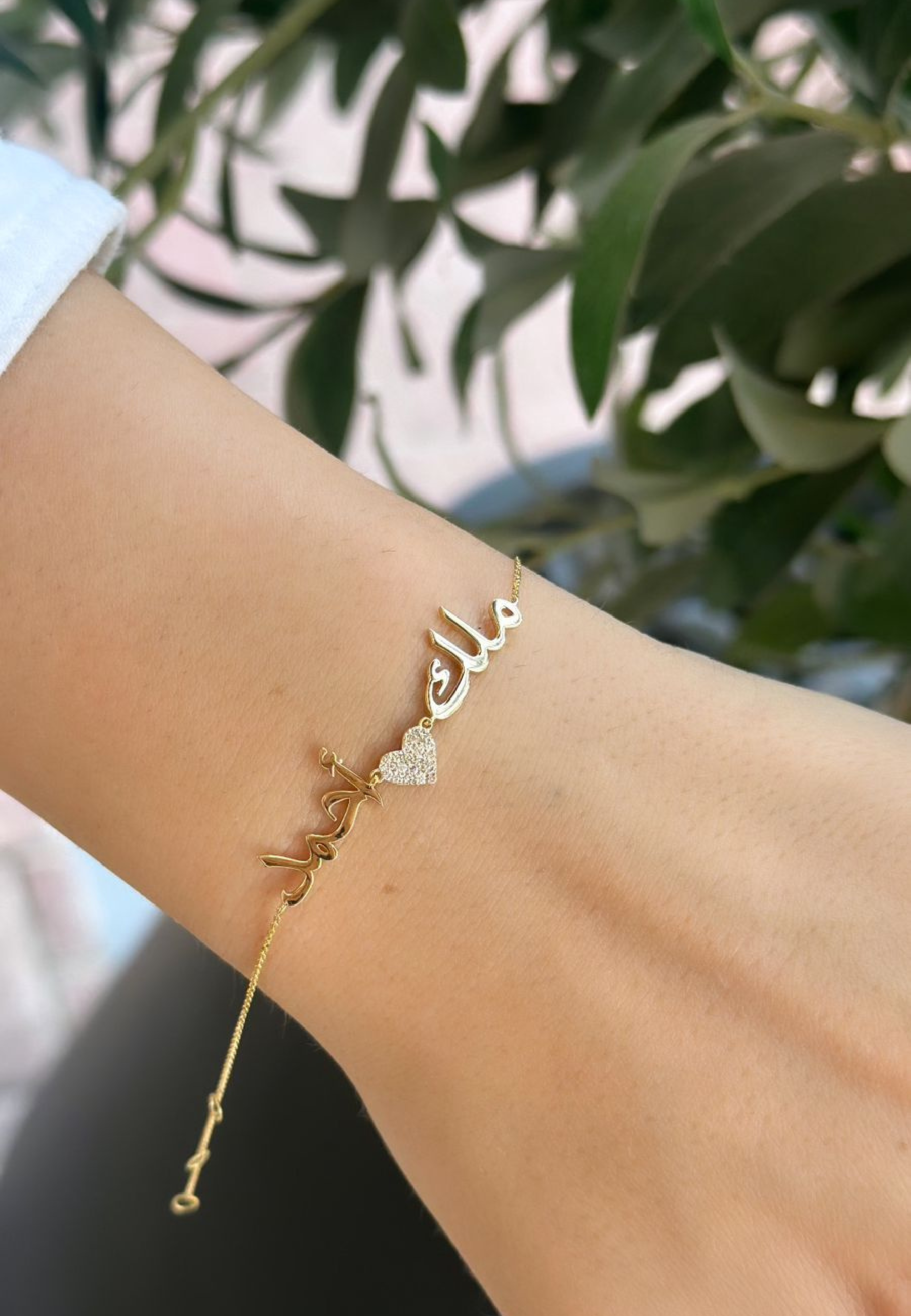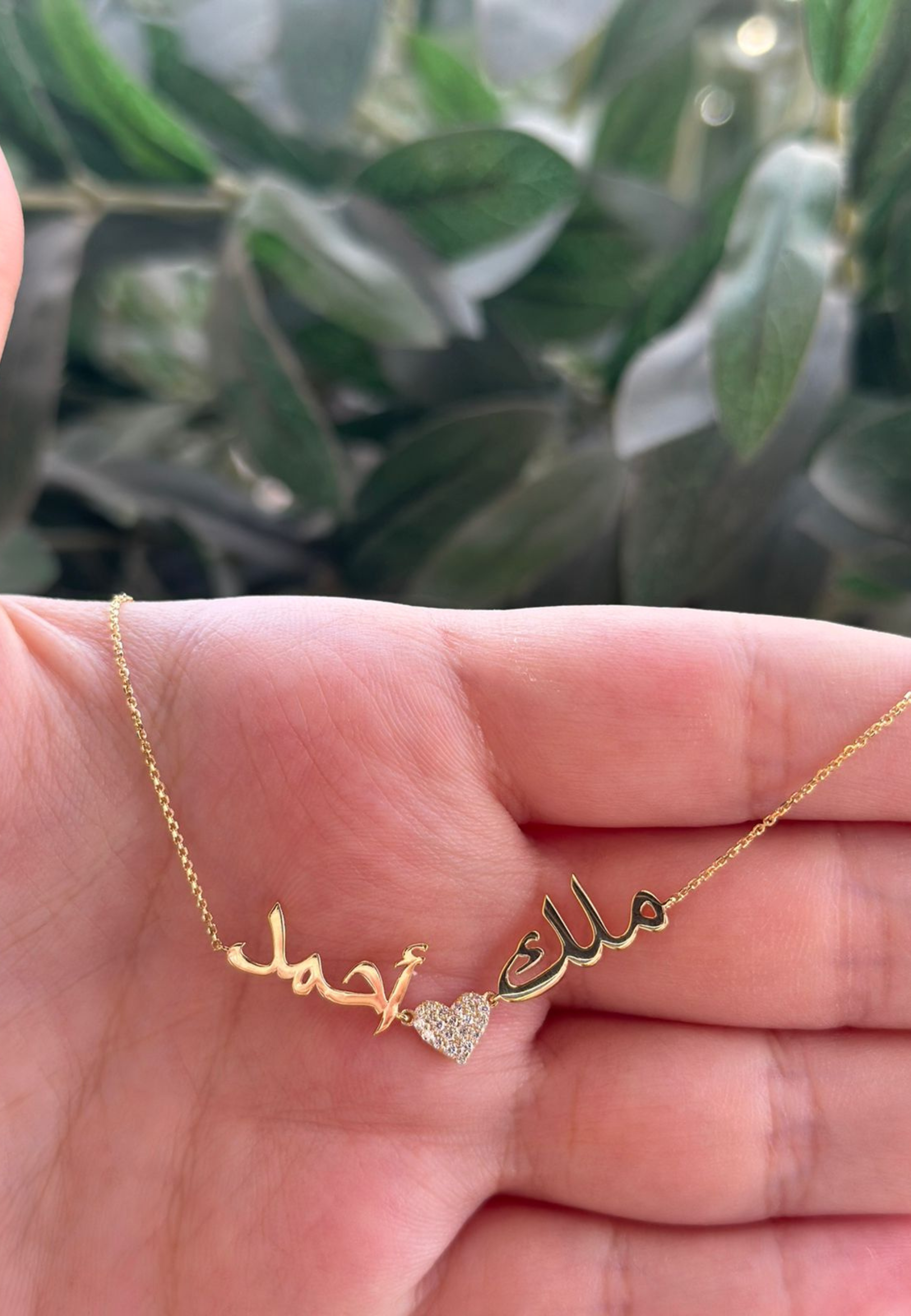 Express yourself with this exquisite charm necklace. Crafted in radiant yellow gold, it features personalized Arabic calligraphy. A heart shaped diamond, brilliant cut, adds a touch of sparkle and elegance. Suspended vertically, this necklace is a sophisticated blend of cultural significance and modern design, perfect for everyday wear or special occasions.