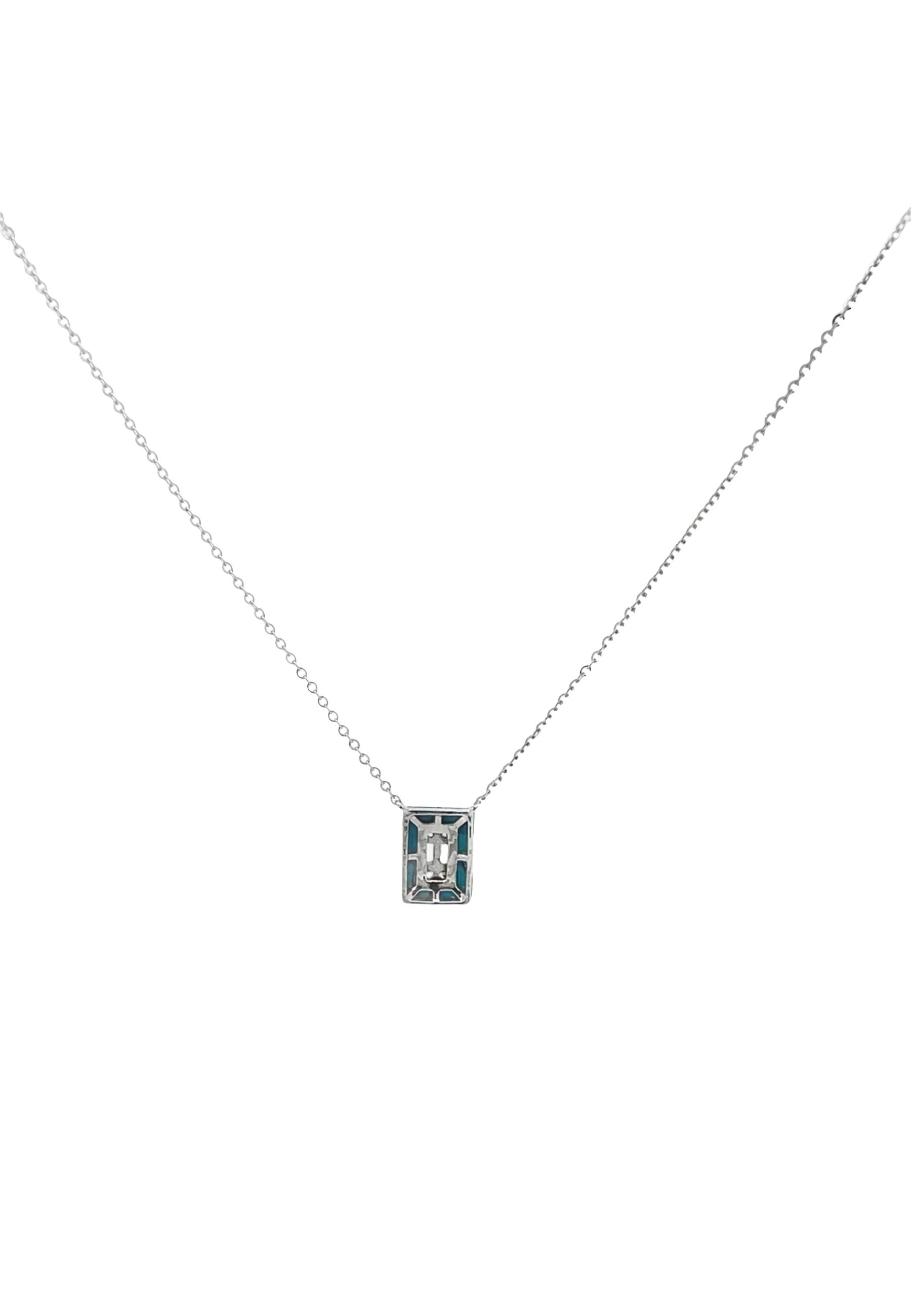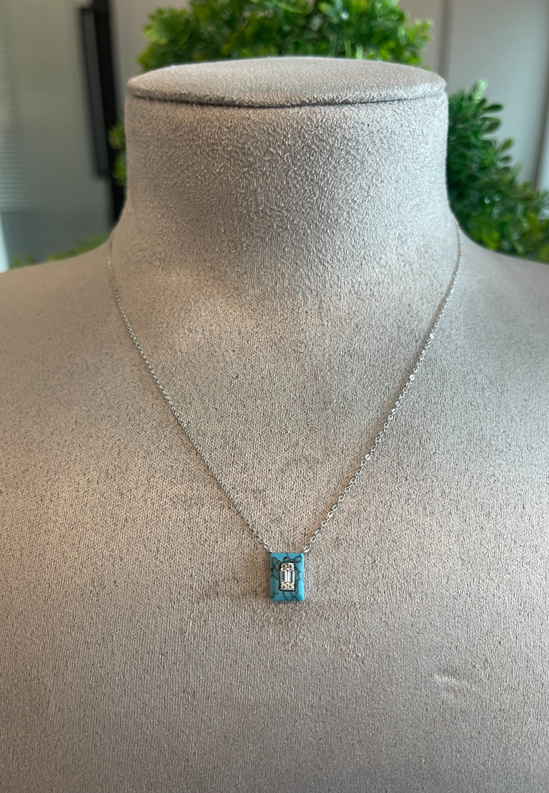 18KT White Gold Rectangular Fairouz with Zircon Necklace