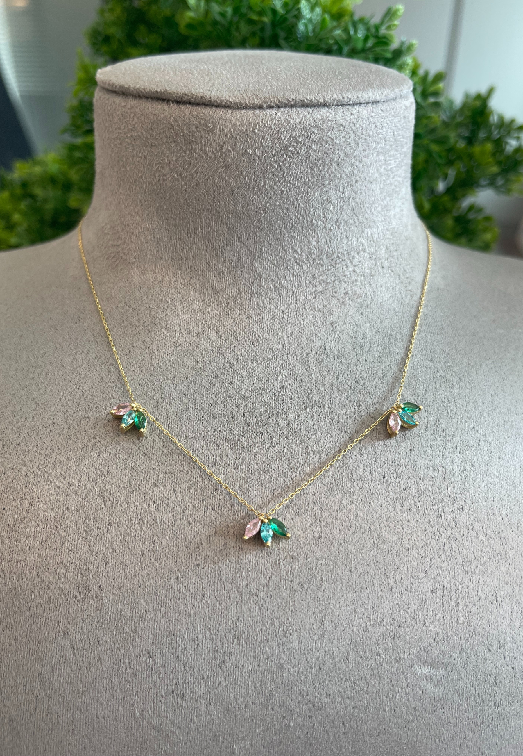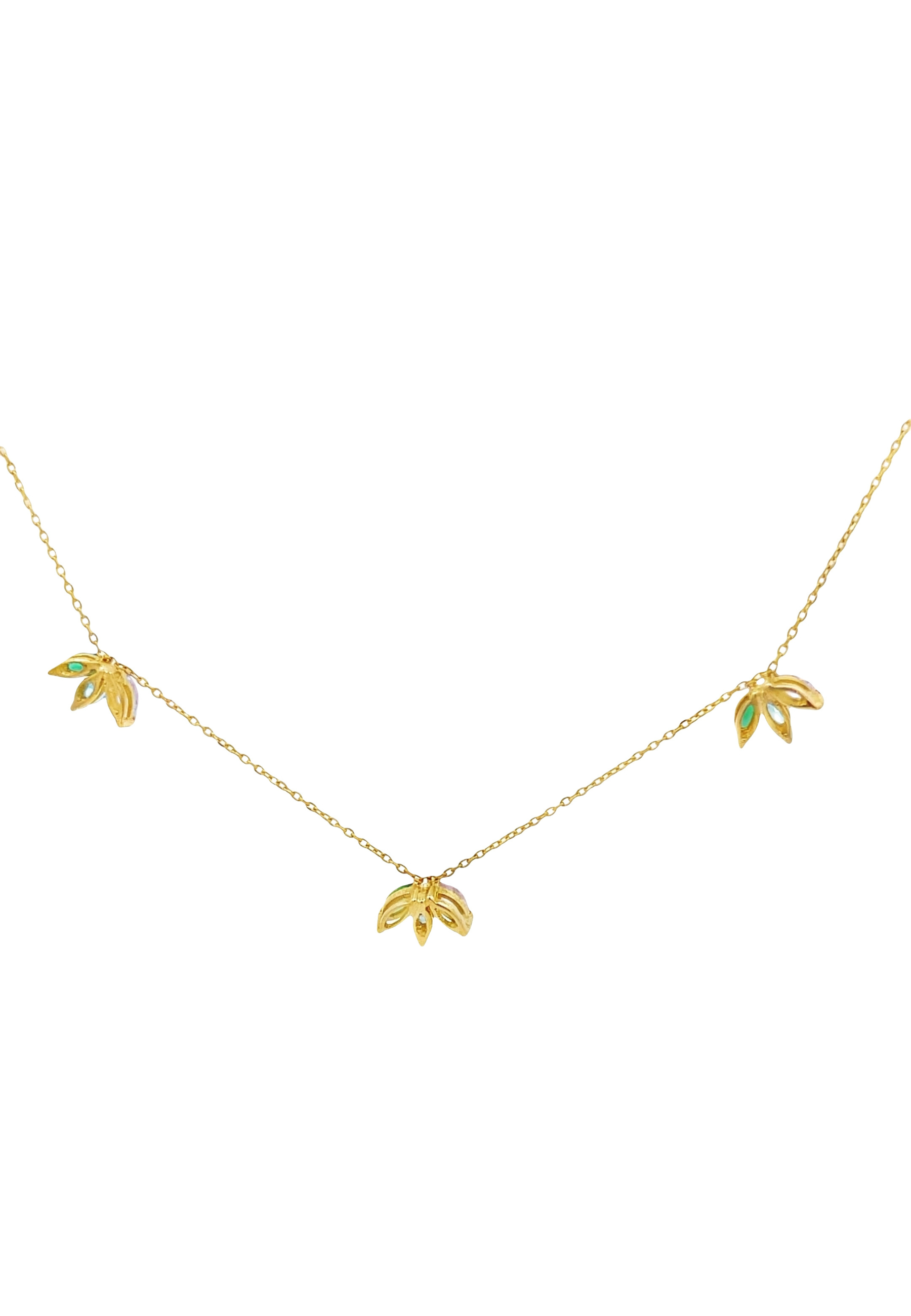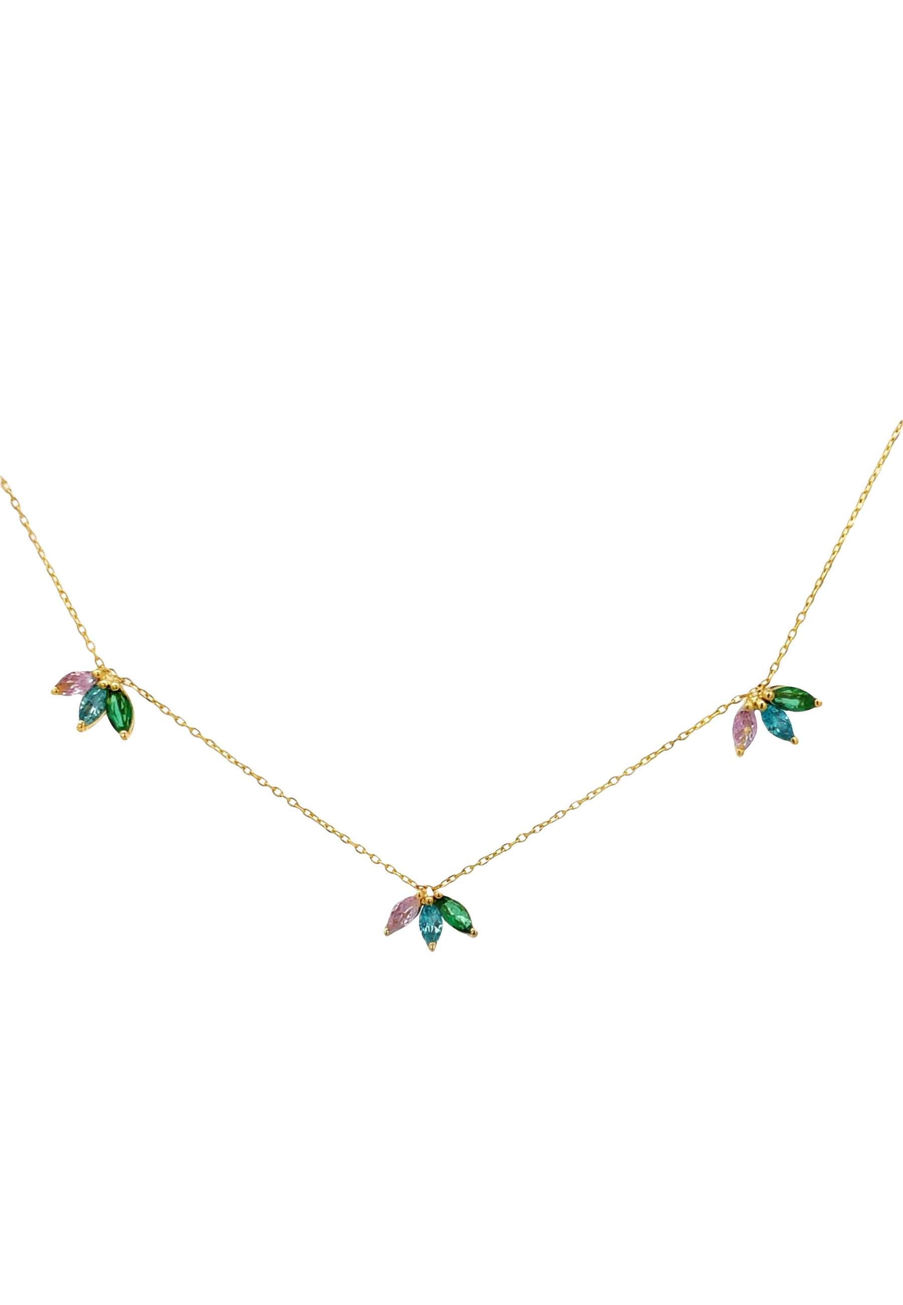 This 18KT gold necklace features a marquise-shaped design adorned with multi-colored semi-precious stones, offering a vibrant and elegant touch. A lively statement piece that blends color with timeless sophistication.