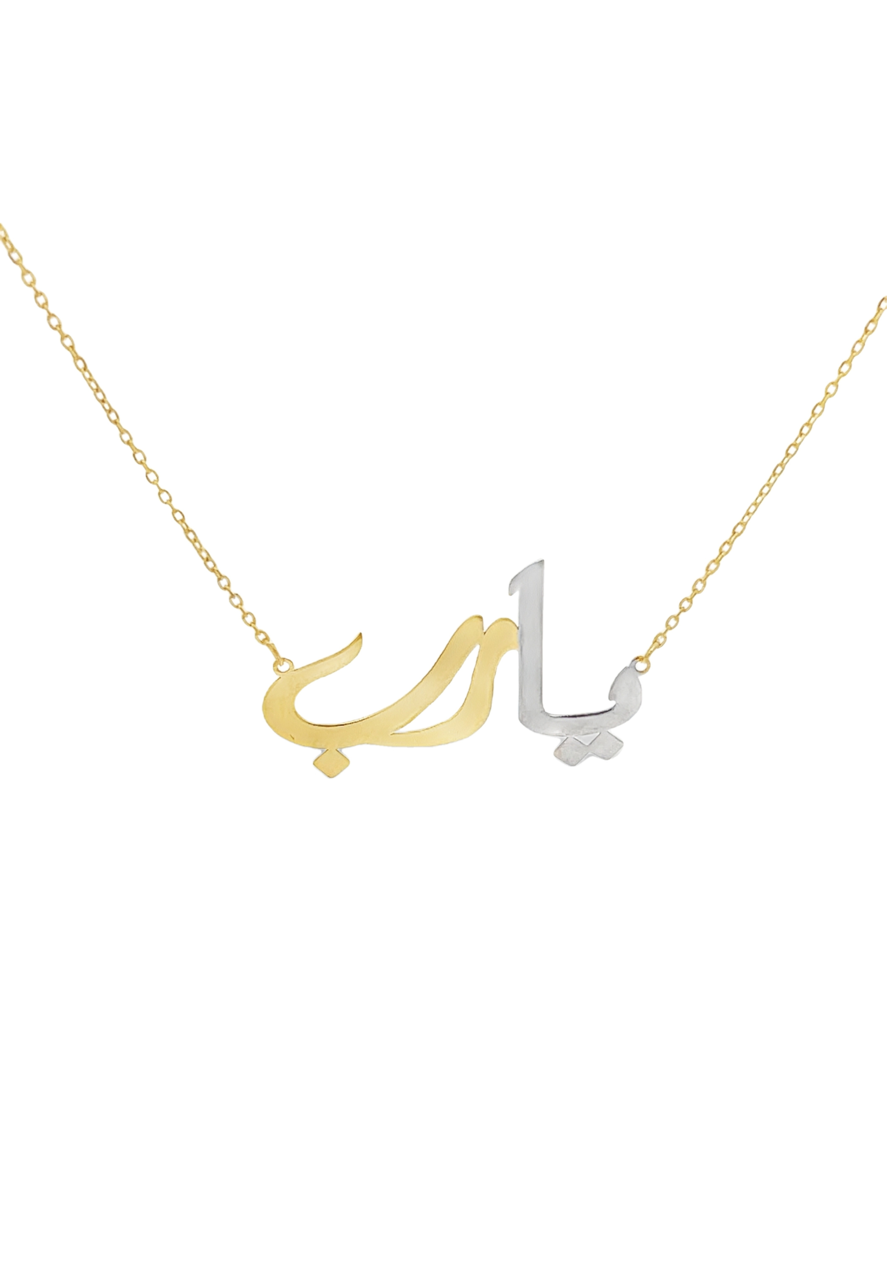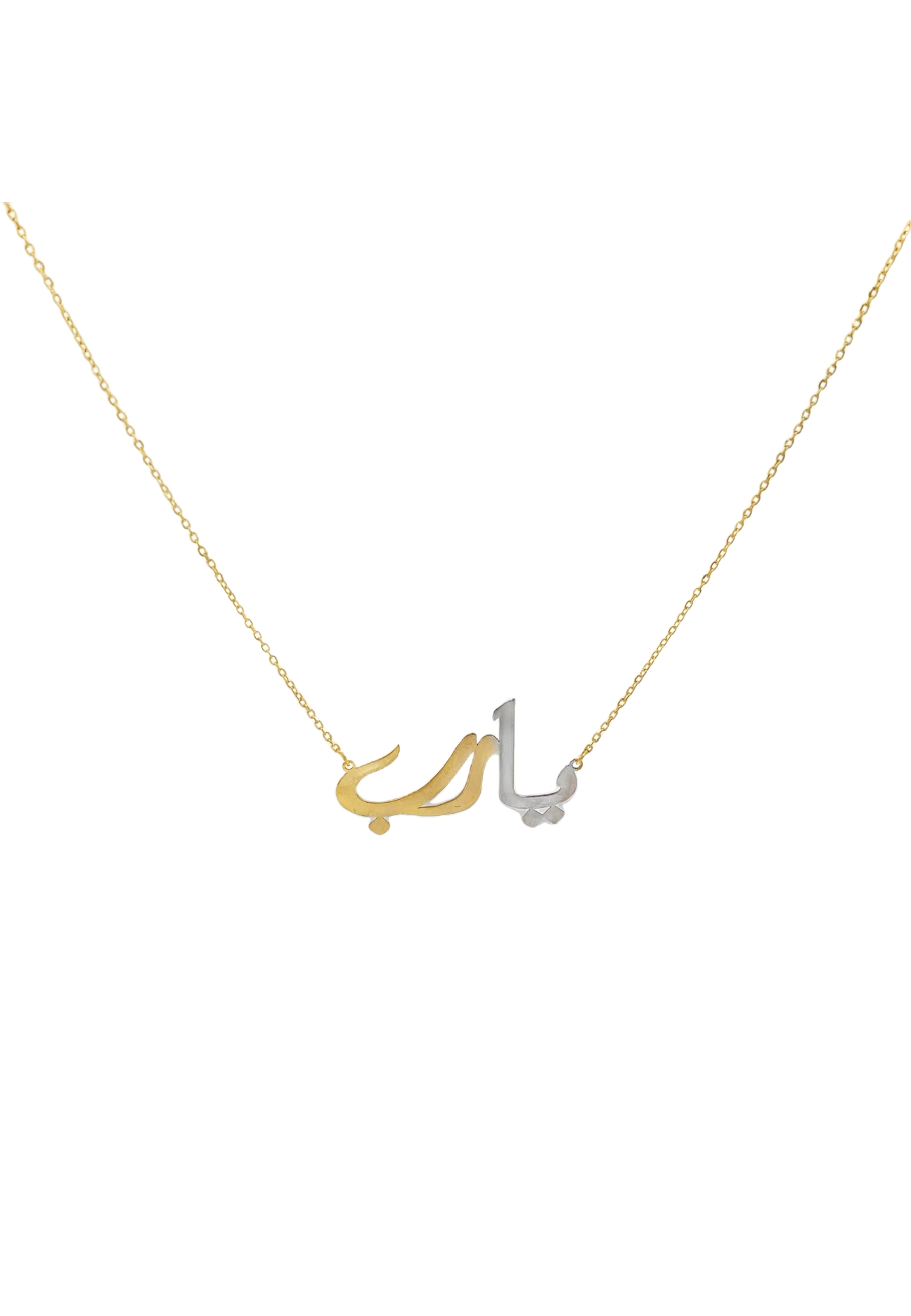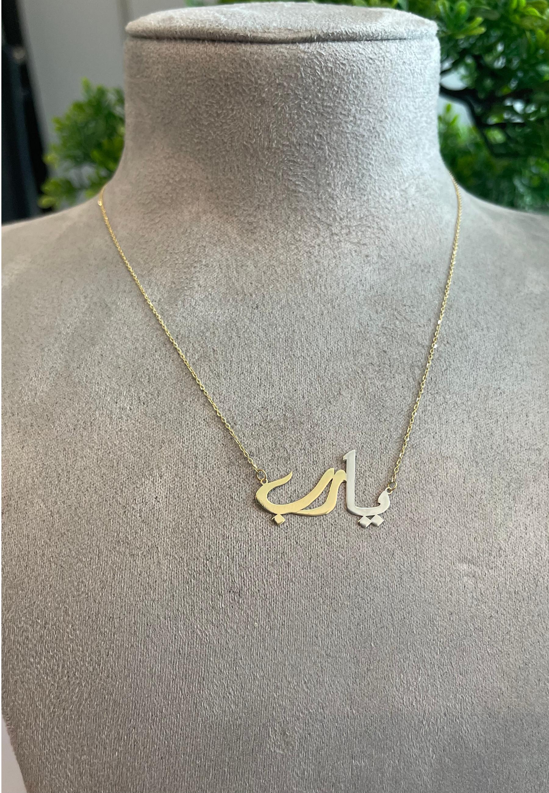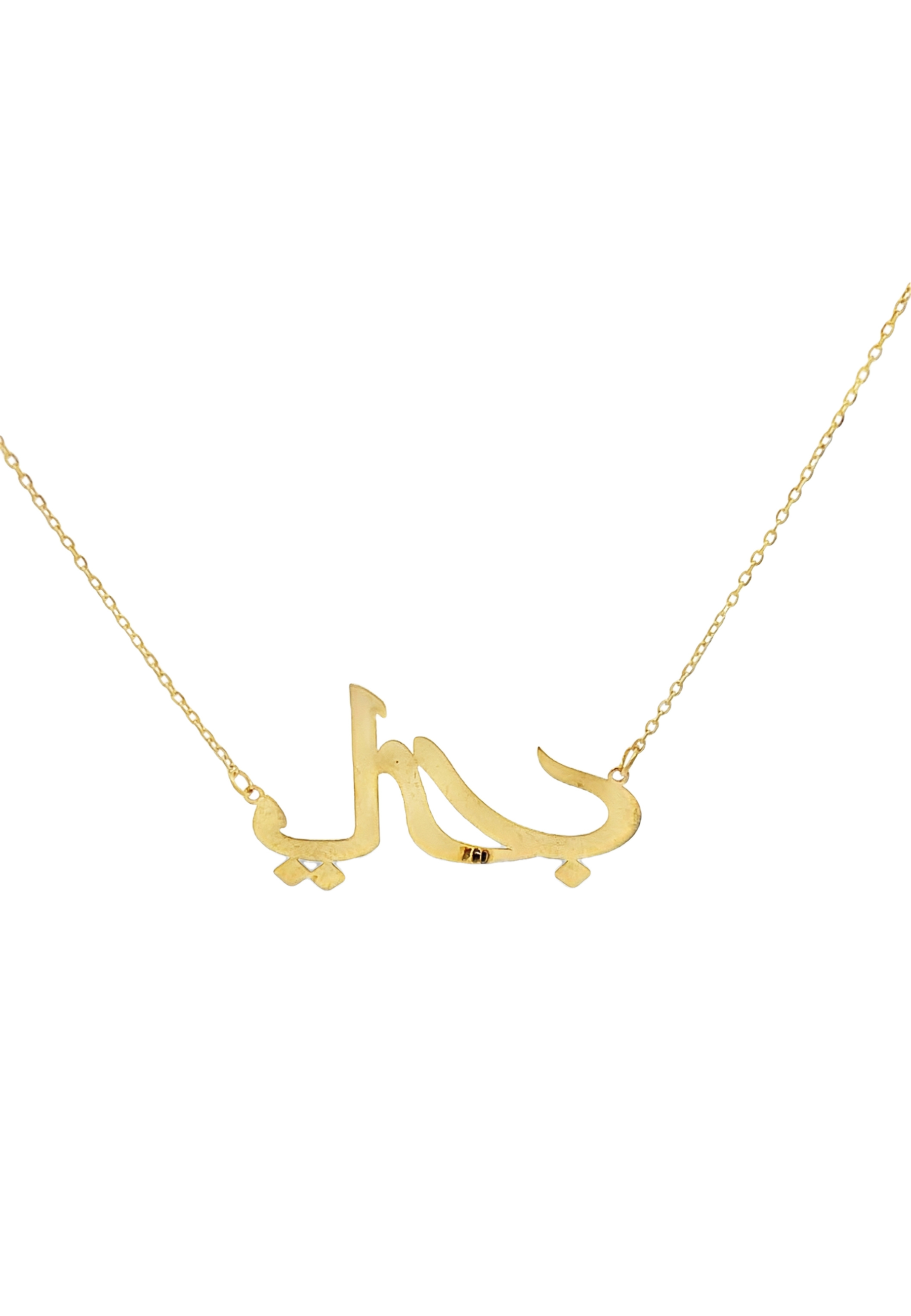 This elegant pendant features an exquisite Arabic inscription, gracefully suspended on a delicate gold chain. The minimalist design and cultural significance make it a timeless piece perfect for everyday wear or special occasions.