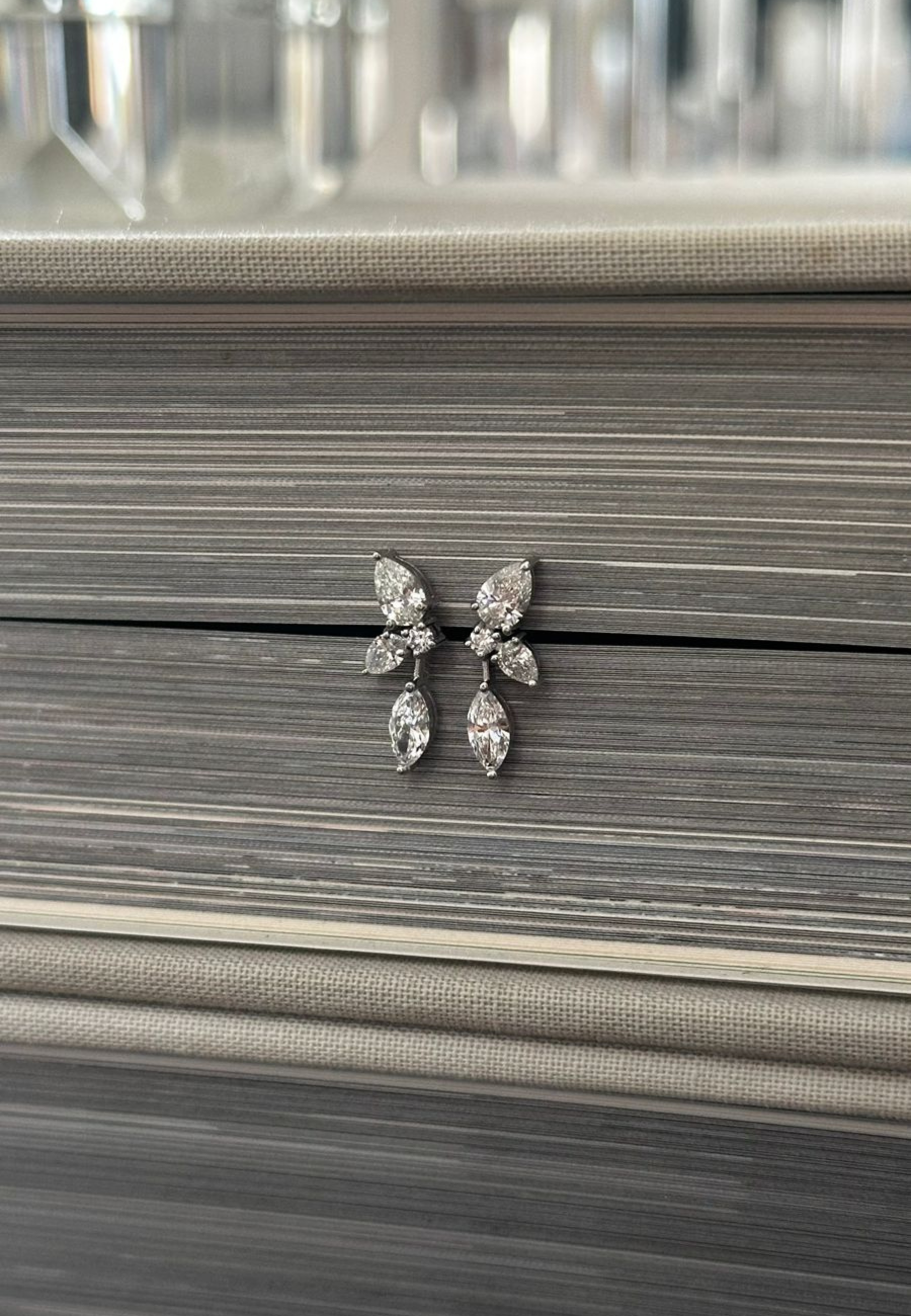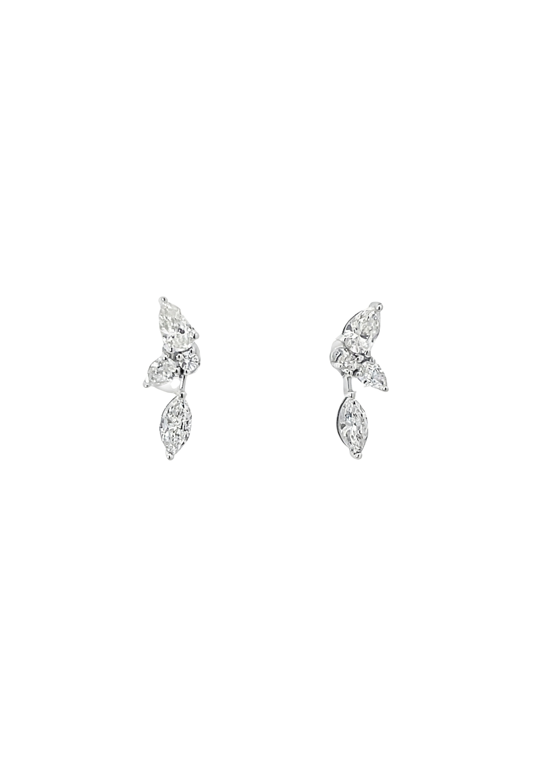 These 18KT white gold earrings feature pear-shaped natural diamonds arranged in a delicate flower design, radiating brilliance and elegance. A timeless piece perfect for adding sparkle to any occasion.